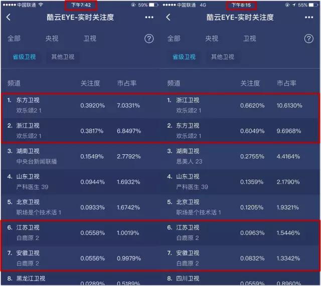 刚播时的两剧和播出半小时后的酷云实时数据对比