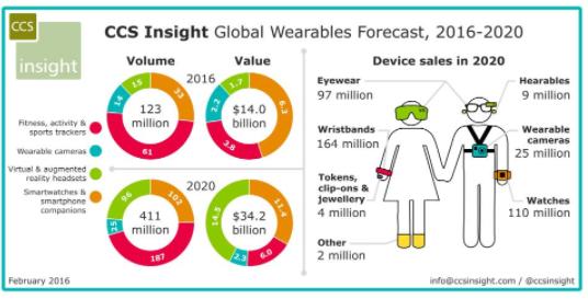 来自CCS Insight的数据显示,预计到2020年智能可穿戴设备的出货量为4.11万件,销售额将达到340亿美元。而2016年的出货量为1.23亿件(IDC的数据为1.02亿件),销售额为140亿美元。其中,依然是以智能手表和健康追踪器为主。但是多家数据显示,这些预测也不是那么准确。