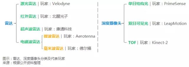 计算机视觉主要由硬件和算法构成,随着如谷歌等人工智能领域的巨头纷纷宣布算法开源,算法模型或将逐步走向统一。在此趋势下,我们认为,未来硬件的差异将在计算机视觉解决方案的优劣判断中占较大权重。目前比较主流的视觉硬件有雷达、深度摄像头等。而按照波长或者发射方式的不同,雷达又可分为激光雷达、红外雷达、超声波雷达和电磁波雷达等。目前主流的深度摄像头主要有三种,分别是单目结构光摄像头、双目可见光摄像头和TOF摄像头。