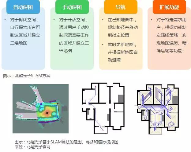 北醒光子自主研发的SLAM算法可提供路径规划、避障、地图定位等多种功能,为客户提供 SDK解决方案,以帮助其实现后续场景识别和导航的开发,其主要功能包括对空间地图的构建、导航、自动避障以及其他扩展功能等。