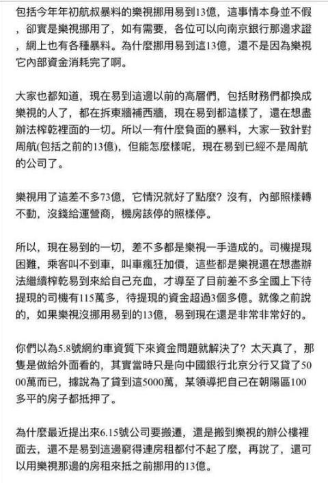 信中还表示:目前全国等待提现的易到司机有115万人之多,待提现资金超过3亿。同时,易到还拖欠员工年终奖和业务报销,最近的搬家的目的公司确实没钱了,同时也是“变相裁员”。