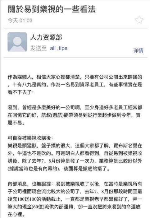 邮件显示这是易到人力资源部邮箱给公司全员发了一封标题为《关于易到乐视的一些看法》的吐槽邮件。邮件里,发信人声称是“易到资深老员工”,“有些事情实在是看不下去了”。信中吐槽:被乐视收购后,易到去年推出冲100返100的促销活动,筹到60亿人民币,但发信人怀疑这60亿和以易到名义借来的13亿贷款都被乐视挪用。