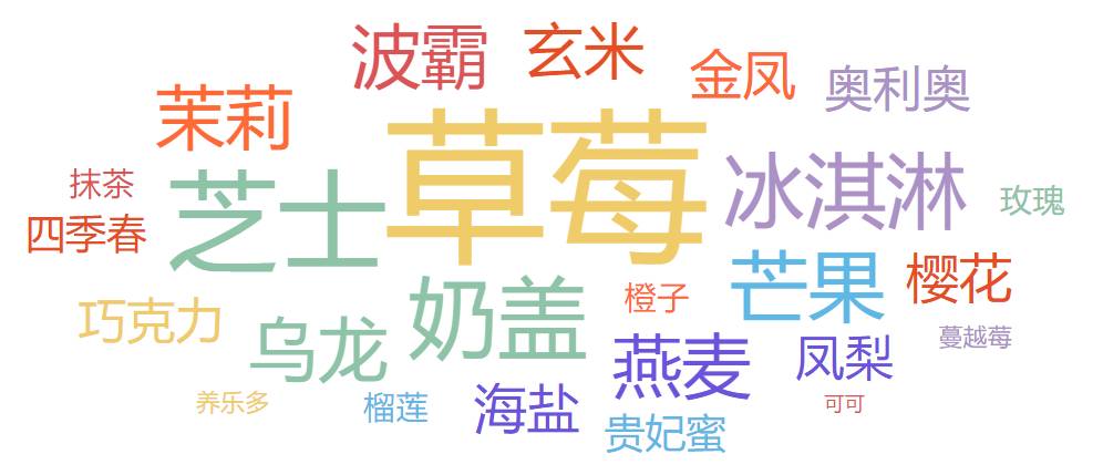 由于此次分析的4个奶茶品牌都同属于网红奶茶品牌,我们VC Insights选择了对这4个奶茶品牌在互联网上的热评进行分析,用一下词云图的方式告诉大家到底是哪些爆款单品撑起了网红奶茶店门面。