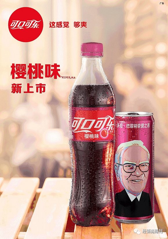 之前,可口可乐在中国推出了樱桃味可乐,还请来了巴菲特做他们的代言人,来了一个“限量版巴菲特卡通包装”。
