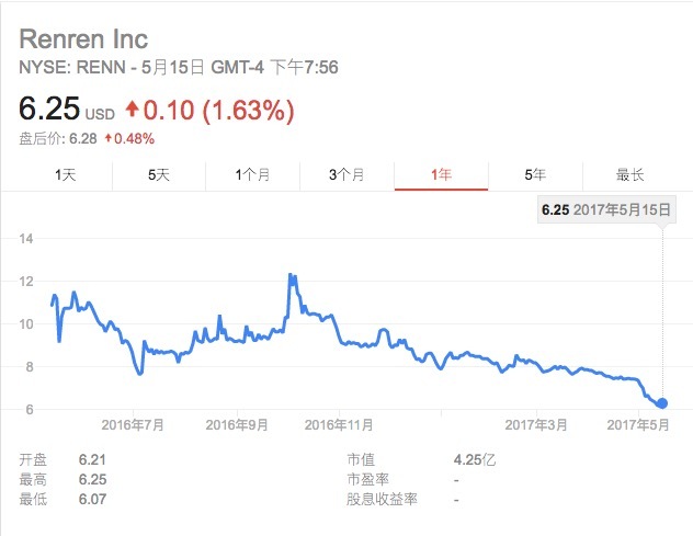 截至美东时间 5 月 15 日休市,人人公司在纽交所常规交易中上涨 0.1 美元,报收于 6.25 美元,涨幅 1.63%。当前总市值为 4.25 亿美元。