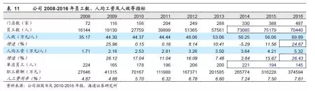 合伙人制度极大的调动了员工的热情,同时也增强了效率。从数据上,我们看到虽然2015-2016年门店数(收入)一直在增加,但总员工数却在下降,这说明了永辉的效率一直在提高,我们可以单店员工数的下降,以及人效与人均工资的快速提高看出。
