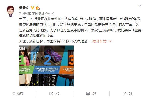 随后,联想集团董事长杨元庆发微博和内部信确认了这一消息。他认为,PC行业正在从传统的个人电脑向“新PC”,即个人计算设备+个人云(Personal Computing + Personal Cloud),乃至进一步向个性化计算设备+个性化云(Personalized Computing + Personalized Cloud)延伸。而中国是新一代智能设备发展变化最快的市场。同时,对于联想来说,中国区既是联想全球化的大本营,又是新业务的孵化器。为了抓住行业变革的机会,落实“三波战略”,我们要推动业务模式和组织模式的变革。