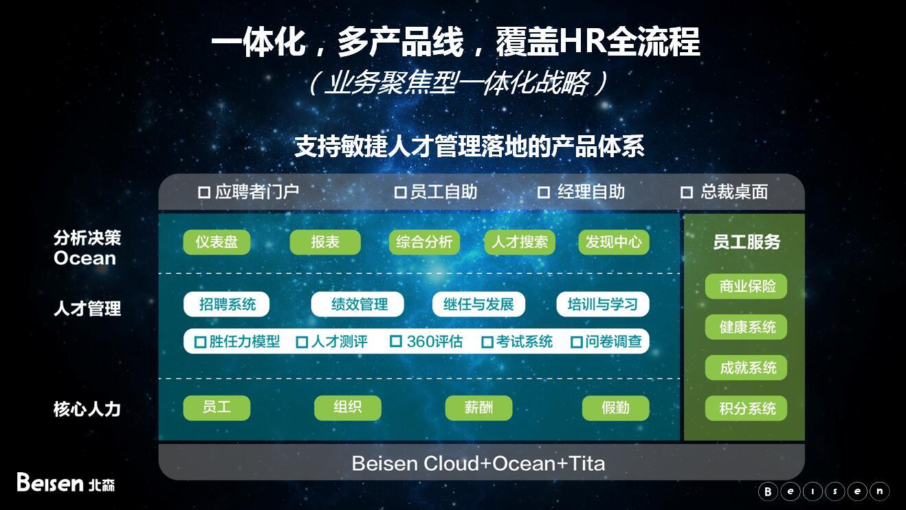 北森是定位于中大型客户,为HR提供All In One的一体化产品,产品线几乎覆盖了HR部门使用的所有软件,包括:人才测评、招聘系统、核心人事模块、薪酬、假勤、绩效、继任等等。此外,我们做不了,就接入了各个生态伙伴,包括:电子签名的上上签、统一登录的玉符、做征信的华道征信、Linedin等招聘网站等,共同为客户提供一站式的产品与服务。