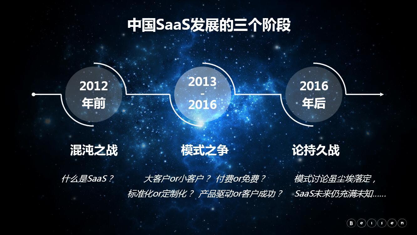 2012年及以前,可以称之为SaaS的起步期。第二阶段是从2013年初开始,经纬红杉等资本涌入企业服务领域,搅动了创业者、投资者、及媒体神经,开始躁动、活跃起来。这是一个极为混乱的时期,各种观点、理念相互掐架,包括:大客户&小客户、收费&免费、标准化&定制化、产品导向&销售导向。2016年中,SaaS进入第三阶段:从躁动趋向冷静,争论似乎已经结束,SaaS也已无秘密可讲。仅用三年,我们走过了美国近十年的路。