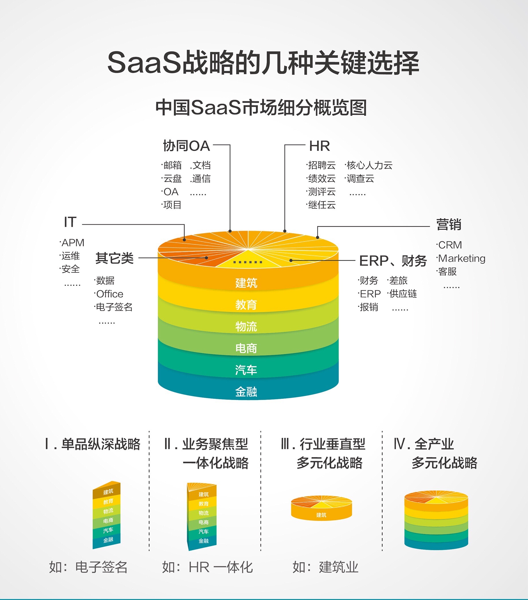 SaaS软件是和企业内部的职能高度相关的,很自然地分成了:HR类,CRM营销类、OA办公协同类、ERP财务类、IT运维安全类等等。而每一个大类又有很多小类,例如:HR软件中的招聘、绩效、薪酬等。同时,不同企业所属行业不同,在运营及管控方式也各不相同,例如:建筑、地产、汽车、物流等等。