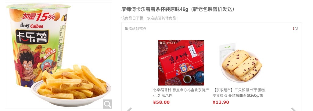 尽管方便面与薯片同属包装类食品看似差异不大,但笔者查看国内方便面市占率前几的老玩家:康师傅、统一、今麦郎、白象时发现,除康师傅 2012 年与日本食品巨头 Calbee 及伊藤忠商事合资成立过一家生产休闲食品的公司,并计划生产薯片外,其余玩家似乎还未涉猎看似火爆的内地休闲食品市场。但康师傅与卡乐比的合资关系已在 2015 年破裂,各大电商平台已不见其影踪,京东上挂着“该商品已下柜”。