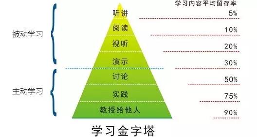 这个方法跟费曼的关系就是说费曼有一个著名的言论,如果一个知识不能给小孩讲明白,就代表自己没有真正明白这个知识。熟悉教育心理学的可能一看就知道,这不就是Learn by teaching(通过教授来学习)嘛,是Active learning(主动学习)的最高境界,也就是下面这个学习效率金字塔的最佳方法。