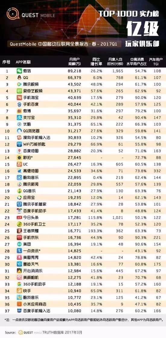 也可以将之视为今日头条的「流量溢出资本」,根据QuestMobile的2017年Q1统计数据,今日头条的MAU虽然排在全榜第27位,但它是中国所有移动应用里,唯一的一个足以比肩微信、在月度人均时长这项指标上能够达到四位数的产品。