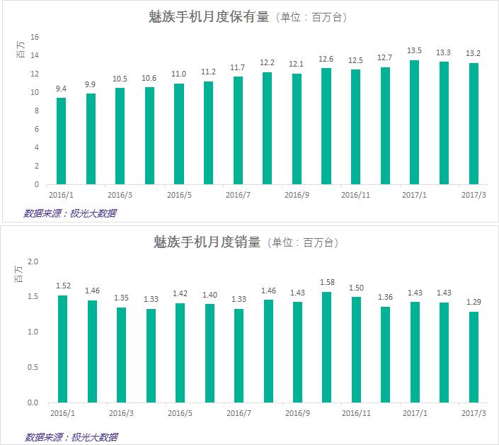 图说:根据极光大数据提供的数据显示,魅族在2016年的全年销量为1700多万台,极光的销量数据统计方法是国内市场新增的活跃终端数量(活跃定义为设备在统计周期内至少有一次联网行为)。