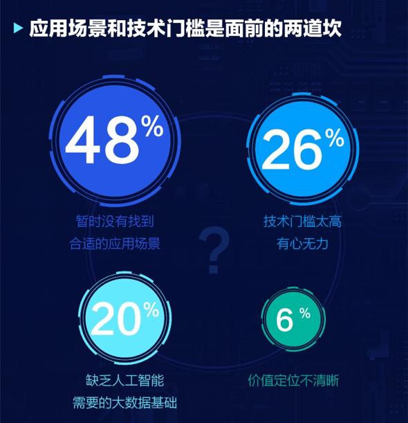 数据显示,场景限制成为中小创业者拥抱人工智能技术的最大阻碍,占48%。而技术门槛太高,让26%的中小创业者有心却无力做人工智能。