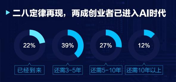 调查中,78%的中小创业者也认为即使在全球科技巨头纷纷加码人工智能的背景下,真正的人工智能时代仍尚未到来,这一结果也颇为巧合的印证了“二八定律”,看到趋势的往往是少数人。