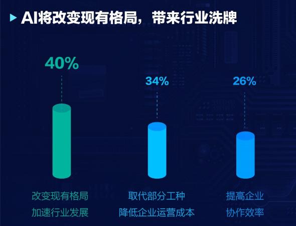 调查数据也支持了这一实例。60%的人认为人工智能出现会取代部分工种,降低企业运营成本,提高企业协作效率;40%的人表示人工智能会改变现有格局,加速行业发展。