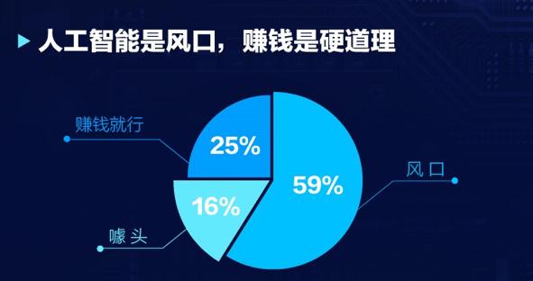 调查显示,59%的创业者们认为人工智能是风口,16%的创业者认为人工智能是噱头。在25%的创业者眼里,无论人工智能是风口还是噱头,只要能赚钱就行。