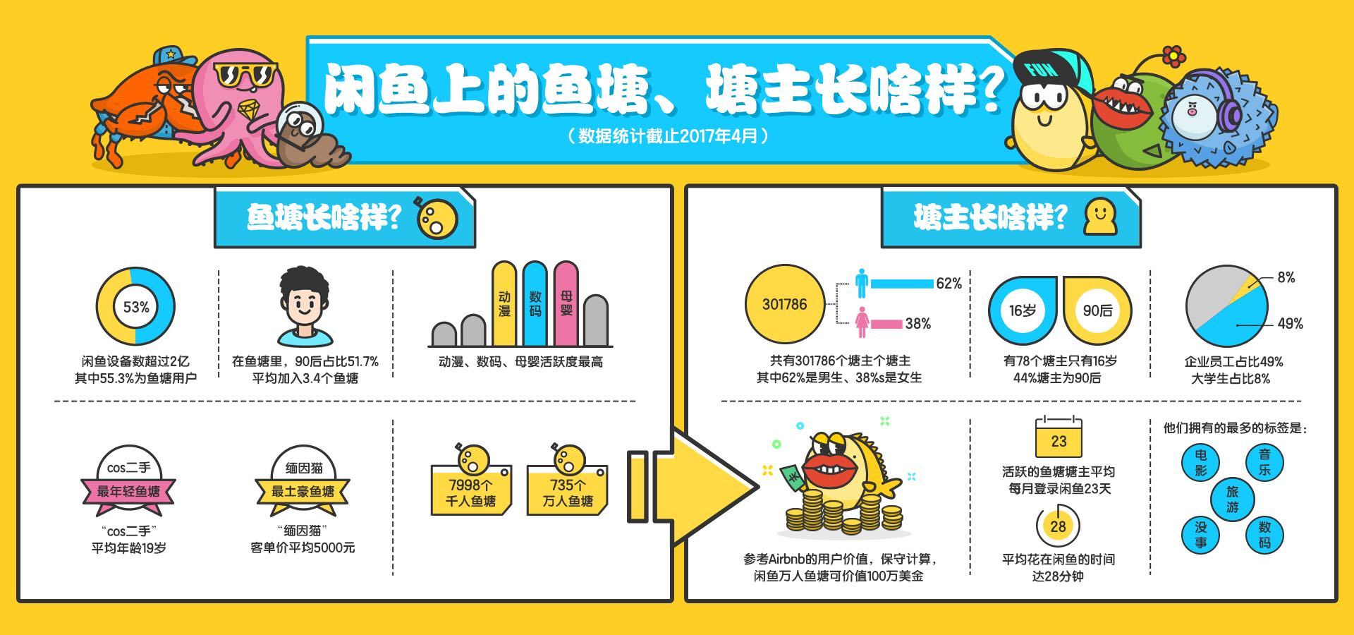 大概是早已发现到了鱼塘的价值。闲鱼去年就说要投资一亿挖鱼塘。据谌伟业给出的数据,目前,一万人以上的鱼塘,已经有735个。截止2017年4月,闲鱼上共有55.3%的用户加入了鱼塘,而总体设备量约为2亿。同时闲鱼也给出了一些关于鱼塘的有趣的数据,比如大多数是在一线或者准一线城市,来自广东的塘主最多(请问是因为我们广东人真的很闲吗,求解释……),更多数据可以参见下图。