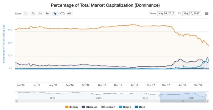 这一点从另一张图就可以看出。根据下面这张主要比特币市场占有率的对比图,在Ripple的异军突起之下,比特币的市场占有率已经首次降到了50%以下。主要用来作为银行间抵偿协议使用的Ripple在过去1个月之内其占用率就暴涨了10倍,使得它突破了原来排名第二的以太坊,成为加密货币市场仅次于比特币的币种。而以太坊尽管被挤到了第3名,大在过去1个月也有2倍的增长,市值接近120亿美元。其结果是在一个月之内,比特币的占有率就从约80%降到了47%,失去了绝对多数的地位。