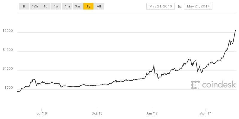 比特币的价格市值最近1年的时间内出现飙升的。从CoinDesk的历史数据可以看到,在1年前比特币的价格还不到500美元,但到了今年1月1日的时候,其价格就已经达到了997美元,此后经过一阵高开低走,在上月底时又回落到了935美元的近期低点。再之后开始触底反弹,一路飙升,在不到一个月的时间内涨了1000美元。