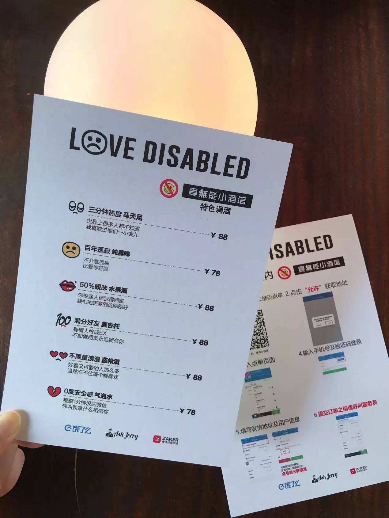 如果你在5月20日这一天逛到上海新天地,会发现顺昌路上的一家酒吧被改装成了“爱无能小酒馆”。门口正对着的是一张哭脸表情,走进店内可以看到除了配合节日气氛的一点小鲜花和粉气球,墙壁和桌椅摆设仍然以致郁系的黑色为主调,菜单上也依然是用丧丧的语调写着“三分钟热度马天尼”、“百年孤寂纯黑啤”、“50%暧昧水果酒”。