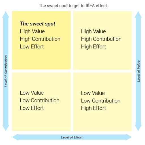 为了找到这个最佳点,我们需要专注于创造一种工作量小却使人感到贡献程度高的产品。通过这种方式才能达到宜家效应。