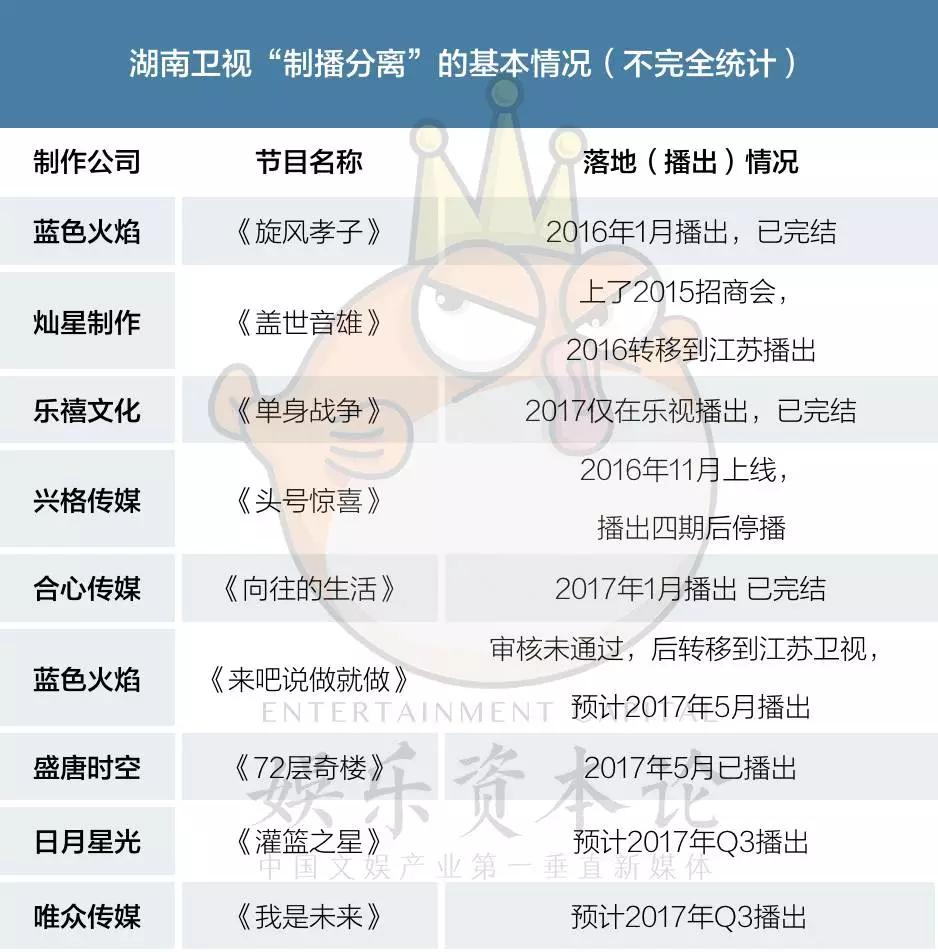 理论上说,一般制作公司提案,会先给湖南、浙江,然后才会去东方或北京卫视。但湖南卫视的“制播分离”口子较小,成果也少。