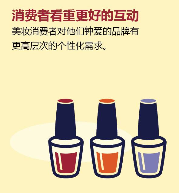 此外,消费者还看重更有意义的互动。调研显示,60%的消费者会定期收到美妆品牌商或零售商的邮件或短信,但只有9%的消费者认为这些信息对其有针对性,48%的消费者表示接收到的信息为一般性信息。这说明品牌商和零售商将面临破解个性化密码的巨大机遇。