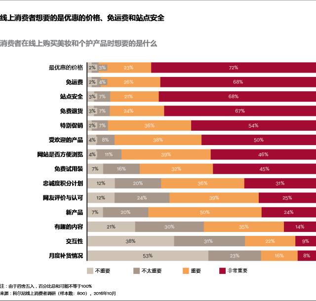说到消费者期望的特性,我们发现消费者在线上购买美妆和个护产品时最看重的是优惠的价格、免运费、站点安全等。但和2014年相比,优惠的价格已经超过站点安全和免运费成为最重要的特性。