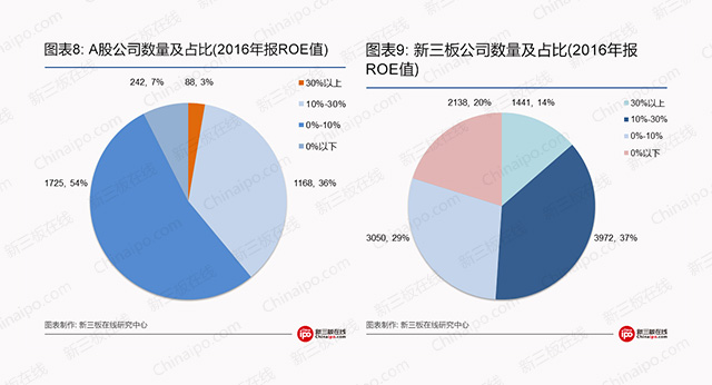 (2)新三板公司的个体经营回报率高于A股,超半数公司ROE大于10%。