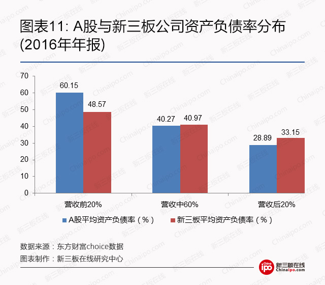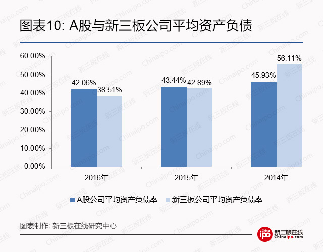 根据新三板在线研究中心的统计,新三板公司2014、2015、2016三年的平均资产负债率分别是56.11%、42.89%和38.51%,呈现出逐年下降的态势。与此同时,A股公司的平均资产负债率也由2014年的45.93%下降至2016年的42.06%。