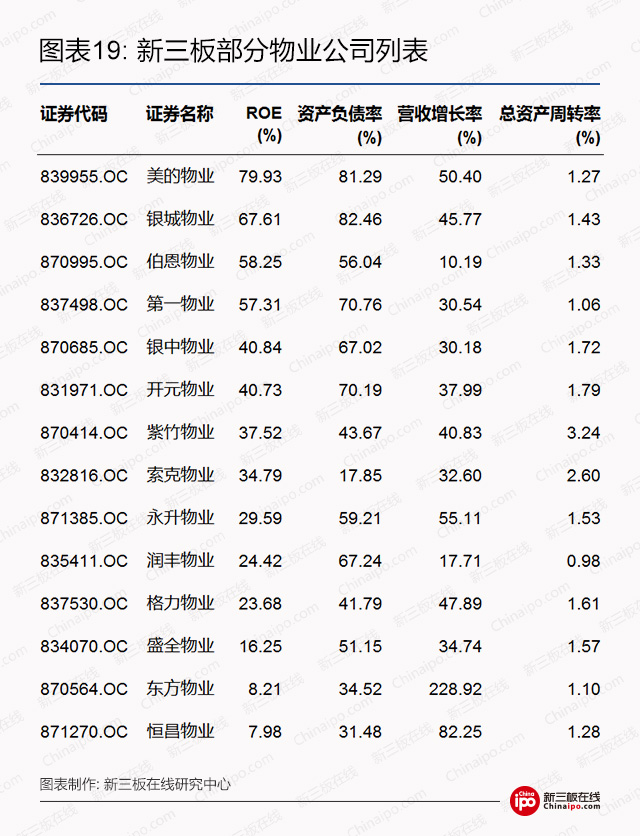 3、新三板各行业中,物业公司在盈利能力、成长性、资产利用效率等方面都要高于行业平均水平,其行业平均ROE高达36.73%。