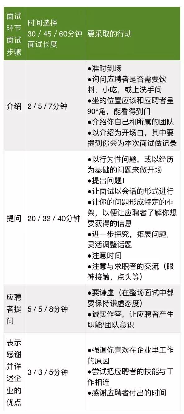在面试过程中,需要营造令人舒服的氛围。以下为面试和应聘者体验的分类表,我们按30,45,或60分钟的面试长度进行了划分。