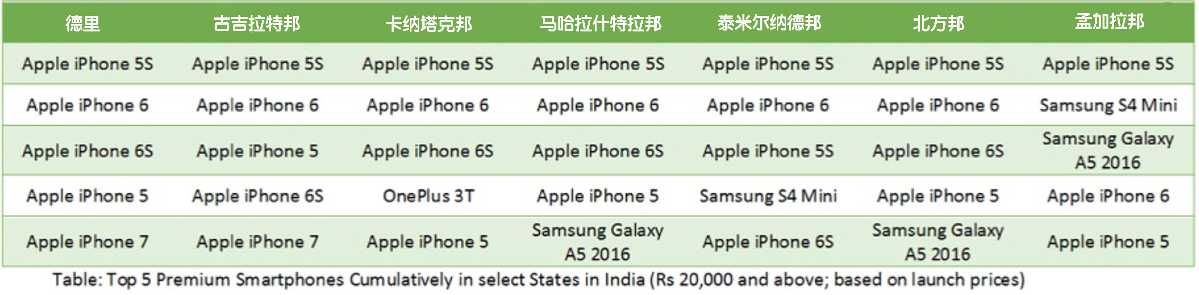 观察上图可以发现,在德里首都区和古吉拉特邦,苹果手机已经完全占据了出货量的前五名。在其他地区,一加3T、三星GalaxyA5以及三星S4Mini仍然占有一席之地。