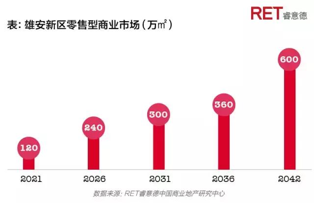 雄安新区的零售型商业市场将伴随产业和城市共同崛起。一方面充足的零售型商业配套是城市吸引人口,提高居民生活品质和幸福感的必要设施;另一方面,零售型商业可创造大量的工作岗位,丰富就业类型和人口层次,是城市实现繁荣的重要基础。雄安新区的崛起是一座新城从无到有的崛起,势必伴随着城市商业的共同繁荣。从人口规模出发,保守估计,未来城市零售型商业市场容量可达600万㎡,相当于40座万达广场。