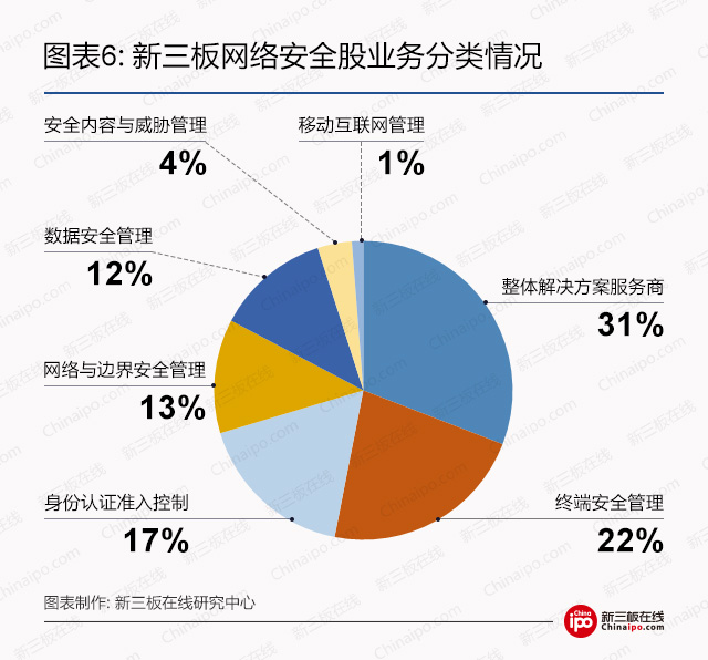 新三板在线研究中心根据主营业务门类,将新三板网络安全企业细分为整体解决方案服务商(31%)、终端安全管理(22.5%)、身份认证准入控制(17.5%)、网络与边界安全管理(12.5%)、数据安全管理(11.5%)、安全内容与威胁管理(3.75%)、移动互联网管理(1.25%)等7大块。