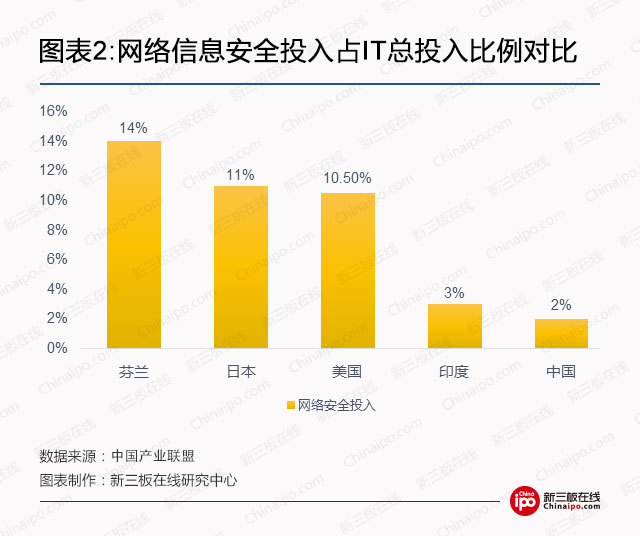 目前,我国已成为全球最大的网络市场,然而网络与信息安全市场投入却严重不足。据CATR数据显示,我国网络安全投入占IT整体投资比重仅为1%-2%之间,远不如发达国家的8%-12%以上,具有很大的潜在市场空间。