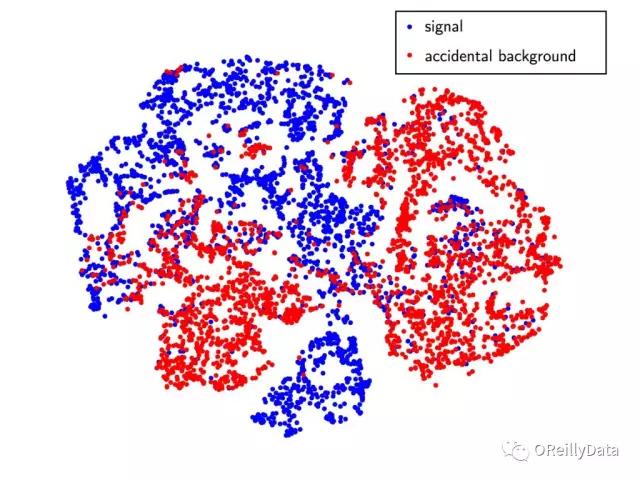 图14 显示信号事件(蓝色)和背景事件(红色)的编码的t-SNE图。蓝色与红色的分离表示神经网络识别出了不在背景中的信号特征,反之亦然。图由Samuel Kohn,LBNL友情提供