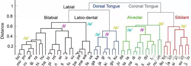 图12 由DNN训练的音节之间的混淆(即误差)构成的树状图,用以分类来自人类大脑活动的语音。我们观察到的语言特征的层次结构,提供了对语言运动控制的皮质组织的新见解。图片由Jesse Livezey和Kris Bouchard友情提供
