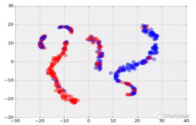 图10 从质量天体图中提取的用2维表示的特征向量t-SNE图。红色和蓝色分别代表了来自两种不同的理论宇宙模型中的质量天体图。图片由Shiwangi Singh和Debbie Bard, LBNL友情提供