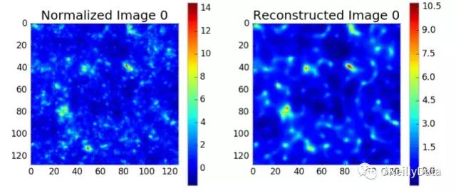 图8 左图:来自宇宙模拟的质量天体图。右图:使用我们的卷积自编码器重建的此天体图。我们平滑了这个天体图,因此丢失了小的细节,但天体图的特征被精确地复制了。图片由Shiwangi Singh和 Debbie Bard,LBNL友情提供
