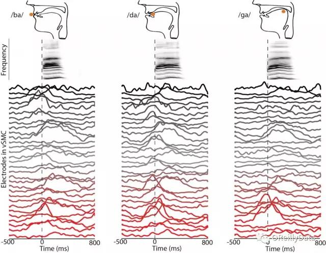 图11 说话过程中人类皮质表面的神经记录。第一行显示了发出辅音“b”、“d”、“g”时的声道的图解示意图。而中间行显示了发出语音“ba”,“da”和“ga”的声谱(以不同频率作为时间的函数的声功率)。下面的彩色轨迹显示了在语音中神经活动记录的时空模式。这些语音声音是通过皮质活动的重叠而又独立的时空模式产生的。图片由Jesse Livezey and Kris Bouchard友情提供