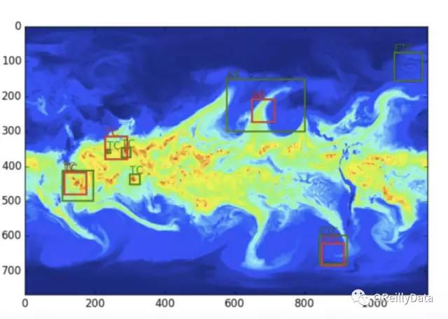 图7 天气模式及其位置的示例结果(真实状况:绿色,深度学习预测:红色)。 图片由Evan Racah,LBNL友情提供