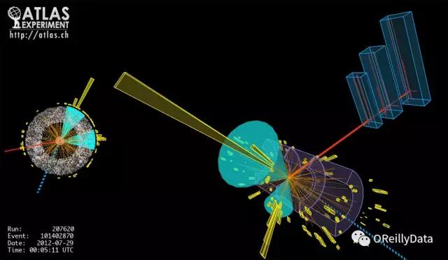 大型强子对撞机(LHC)让质子以能获得的最高能量每秒碰撞4000万次。每次碰撞会产生能在诸如ATLAS检测器(图15)这样的仪器中检测到的粒子喷雾,其中电子设备的数亿通道试图发现前所未知的新粒子。LHC的高曝光度升级(HL-LHC)版预计会使碰撞速度提高一个数量级。来自当前检测器的数据已经达到数以百计的千兆字节。处理这些巨大且复杂的数据的唯一方法就是使用检测器上的“触发器”和离线数据分析的过滤器来快速过滤掉大部分数据。在触发器对数据进行采样完成后(大约每秒200个事件),再将其重建为诸如粒子轨迹和能量沉积物的对象,每个事件降低到数百维。然后进一步采样得到分析数据,其具有取决于感兴趣的特定物理现象的数十个维度。图16展示了一个碰撞事件所展示出的这些检测器信号和更高级重建对象。