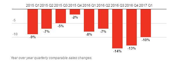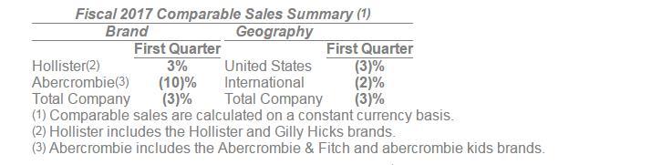 昨日晚间,A&F公布了最新季度的财务报告。在截至2017年4月29日的一季度,A&F的营收为6.61亿美元,同比下跌4%;可比销售同比下降3%,连续4年16个季度没实现增长;公司的亏损额从去年的3960万美元扩大至6170万美元。