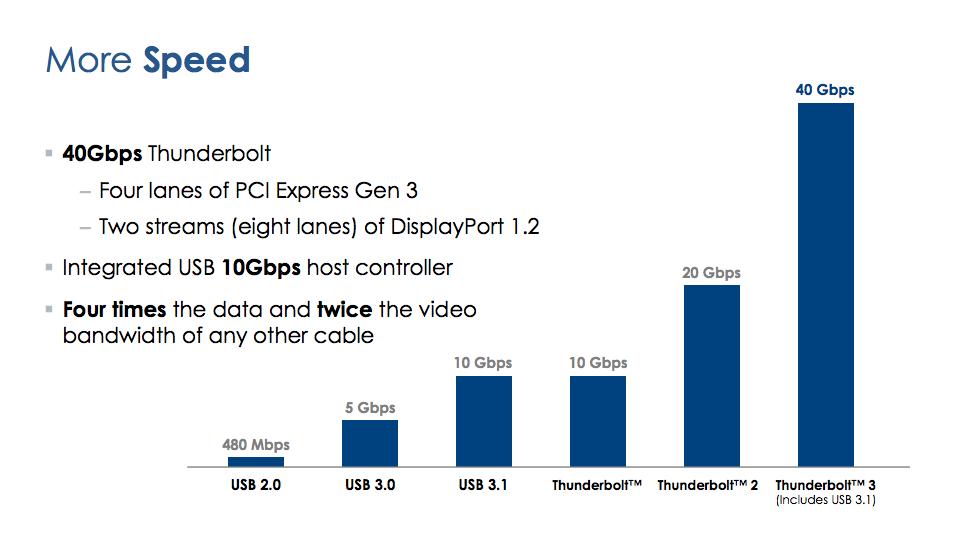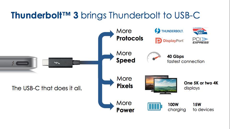 为了让更多人的使用该接口,公司还打算把Thunderbolt 3整合到Intel CPU中,并将于明年发布使用Thunderbolt的规范协议。如果Thunderbolt 3被整合到CPU中,那么电脑生产商就可以制造更薄和更轻的系统。这也是首次,电脑上所有的接口都变的一样了。