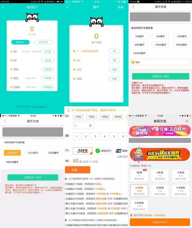 综合类直播平台熊猫直播上面,Android端60元可以充值600猫币,但iOS端仅能充400猫币,刨去苹果的30%渠道费后的净收入为42元,同比多赚了2元。
