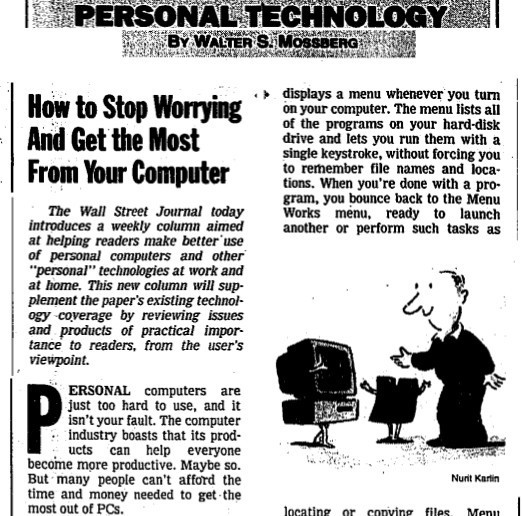 首先我们从1991年10月17日开始,那时我在《华尔街日报》的“个人科技”专栏写下第一篇文章,我们从文章的第一行开始,这行文字经常被人引用:“个人计算机只是太难使用了,这不是你的错。”当时的确如此,许多许多年之后仍然如此。界面让人困惑,大多科技产品老是需要调整和维修,需要的技术又是大多人不具备的,或者说是他们不愿意掌握的。整个行业是全新的,工程师没有为普通人设计产品,这些普通人有其它的才能和兴趣。
