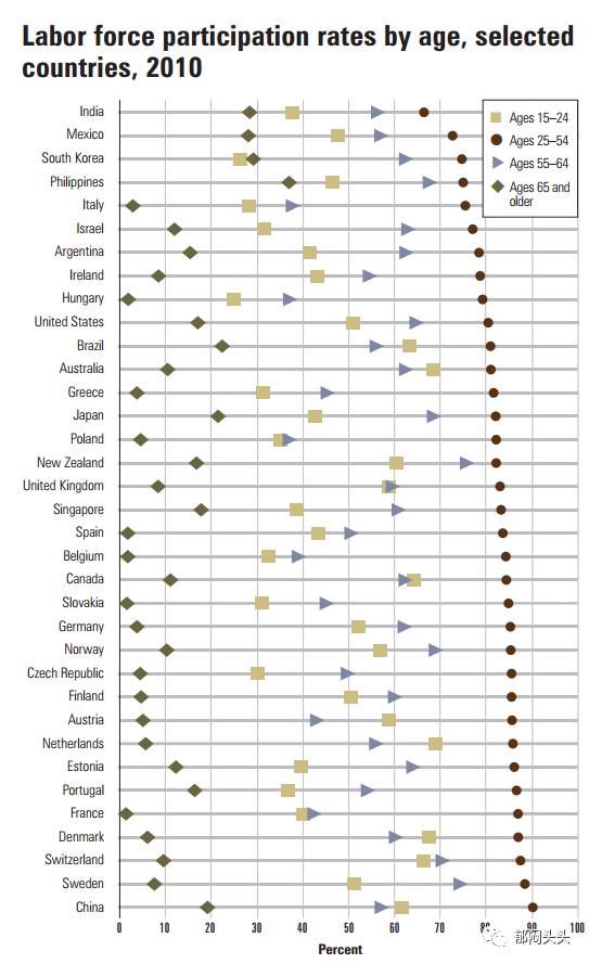 中国的90%真心让人惊叹,基本上在家里坐吃山空会被人鄙视,更重要的是这是男女平均的结果。如果男人出去工作的比例达到90%的话,女人也必然达到90%。中国内部55岁到64岁与25-55岁两个数据相比,也存在较大差距,主要是占一半的女性在55岁退休,使得刚好在数据上少了30%。另外,印度在各个阶层都落后中国,只有一个例外,那就是65岁以上的就业率,在本该退休的年龄段,却要辛苦劳作,嗨,印度的男人的命啊。。。。